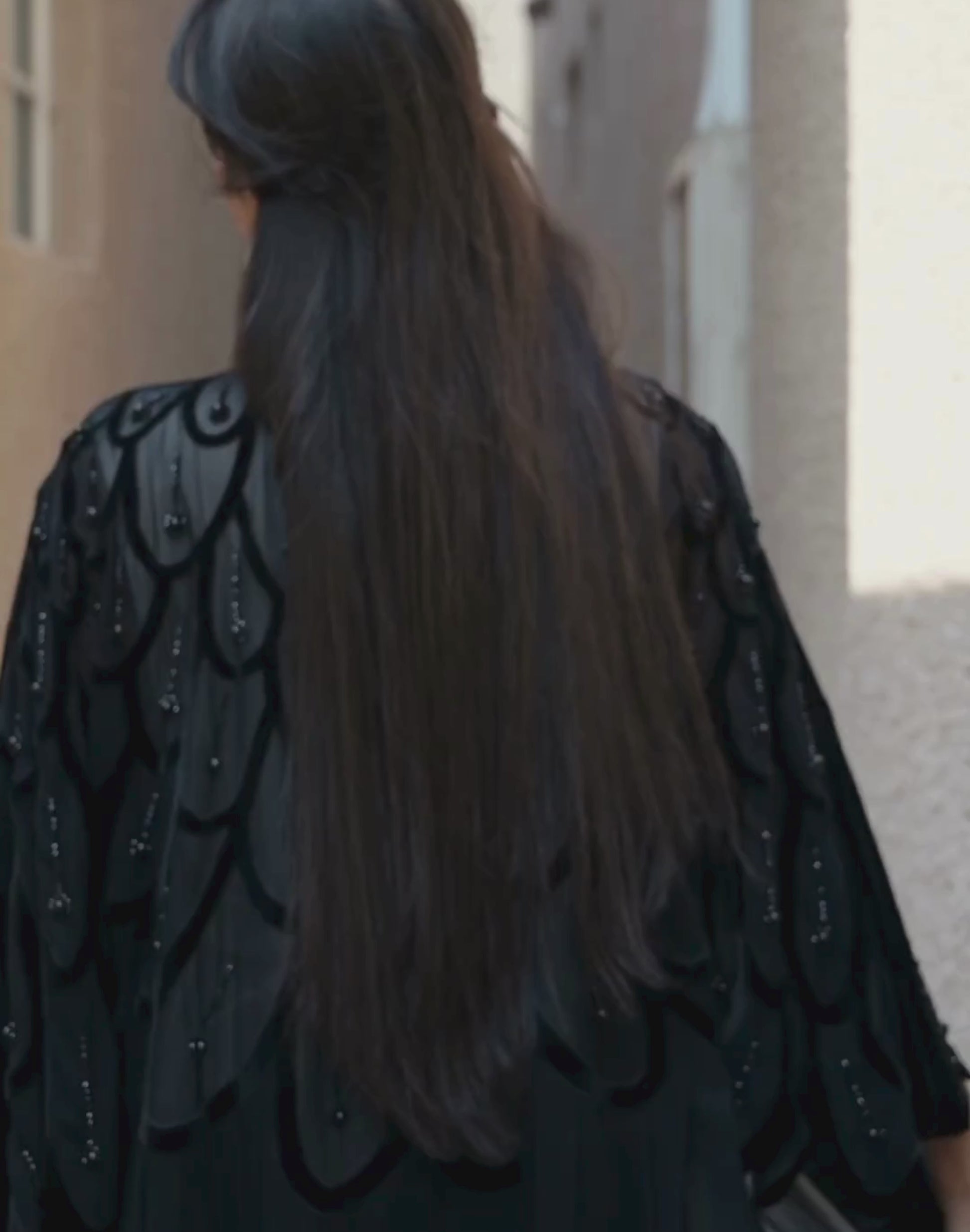 • Explore elegance with our butterfly-inspired laser-cut abaya featuring cape sleeves and intricate black bead embroidery detail, perfect for fashion enthusiasts browsing Abaya Online UAE.
